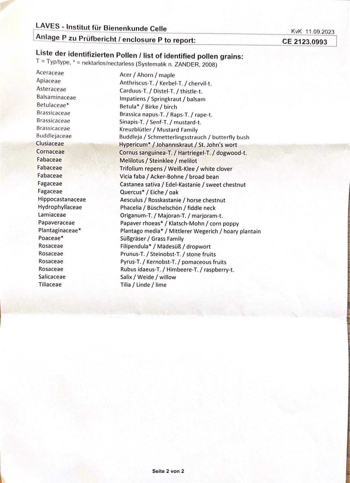 honigtypisch, blumig, leicht fruchtig, aromatisch, kohlig, mittlere Intensität. (Rapsanteil 87%)